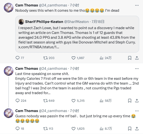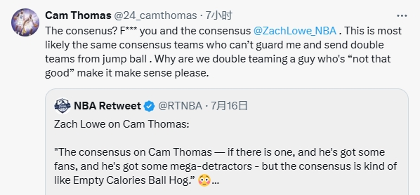 值得一提的是,卡梅隆-托马斯本人不仅看见了这条评论,还在社交媒体上进行了多次回复:“狗屁共识!去你M的共识。那些认为我不行的球队,都从比赛开始就包夹我。既然觉得我'不怎么样',干嘛还包夹我?解释一下。”