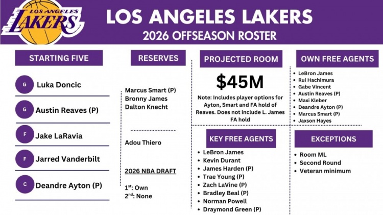 在Marks列出的名单中,湖人的首发阵容有东契奇、里夫斯(球员选项)、拉拉维亚、范德比尔特、艾顿(球员选项),替补阵容有斯玛特(球员选项)、布朗尼、克内克特、阿杜-蒂耶罗。