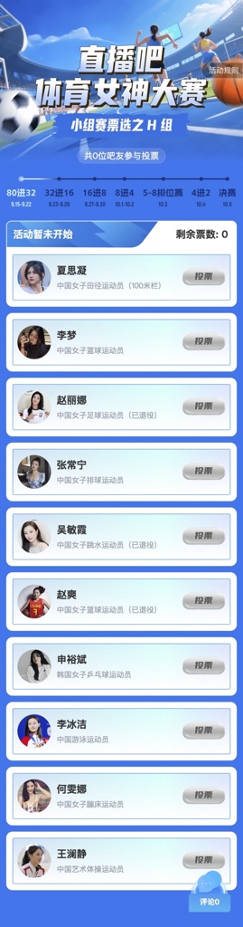 本次小组赛共分为8个小组,每组10名候选者,共80位体育女神参与角逐。