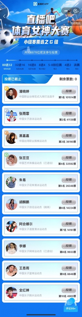 ①潘晓婷(101514票)、②张雨霏(41139票)、③黑嘉嘉(36190票)、④张豆豆(32592票)。