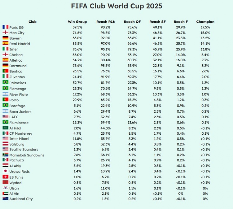6月4日讯 ClubEl预测了世俱杯各球队晋级各阶段的概率,并列出表格,巴黎夺冠概率17.5%最高,迈阿密国际小组出线概率33.7%。