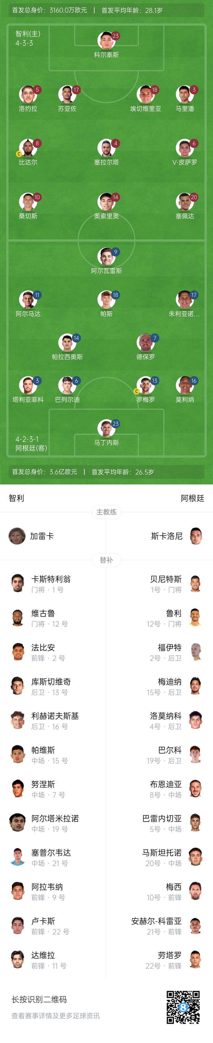 阿根廷首发:23-马丁内斯、16-莫利纳、13-罗梅罗、6-巴列尔迪、3-塔利亚菲科、17-西蒙尼、7-德保罗、14-帕拉西奥斯、11-阿尔马达、18-帕斯、9-阿尔瓦雷斯