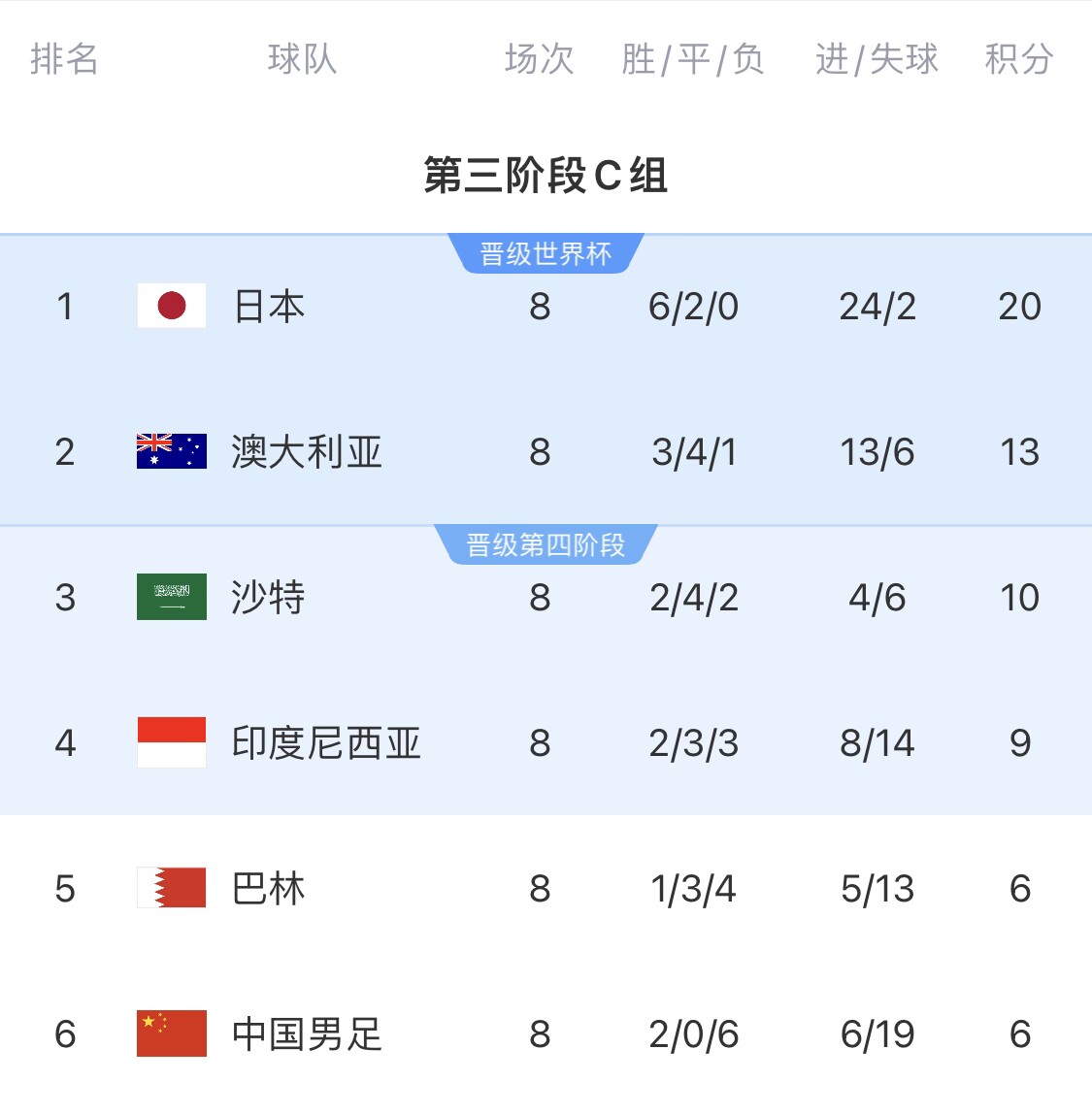 末轮印尼客场不胜日本,国足胜巴林,国足12分晋级附加赛。本轮巴林不胜沙特、末轮印尼客场负日本、国足平巴林即进前4。