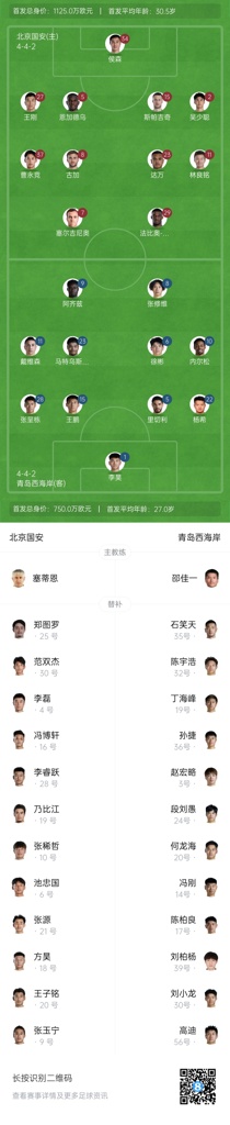 北京国安8胜5平积29分,排名中超第3;青岛西海岸4胜6平3负积18分,排名中超第8。