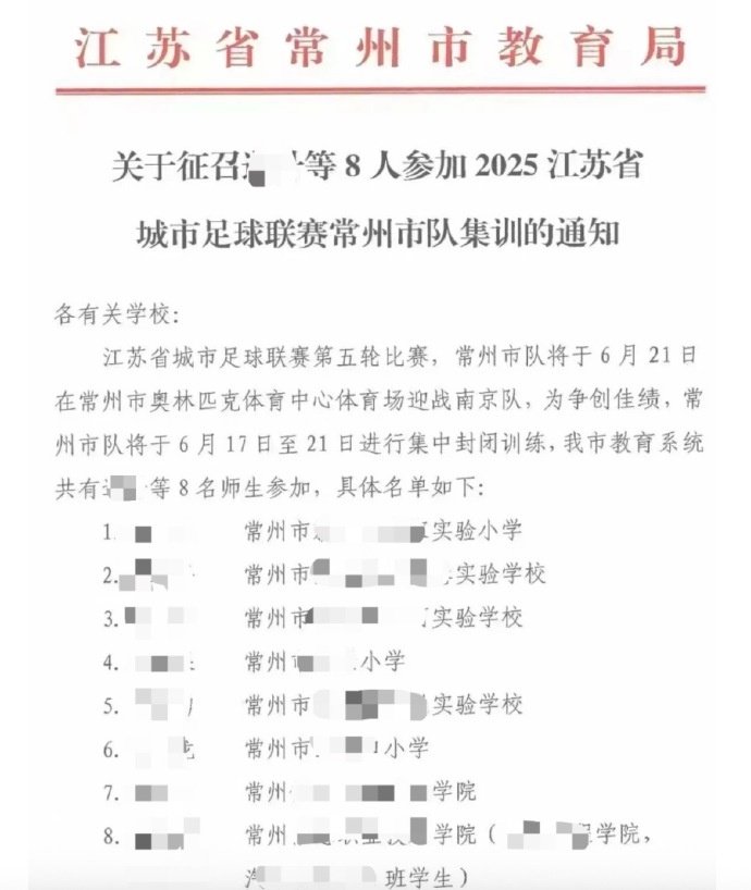 近日,一份常州市教育局下发的红头文件在网络引发热议。文件显示,常州市将组队参加“2025江苏省城市足球联赛”第五轮比赛,为迎战南京队,将于6月17日至21日组织封闭集训,拟征召8名来自常州各中小学、院校的体育教师和大学生参训。文件并载明征召对象具体学校、职务。